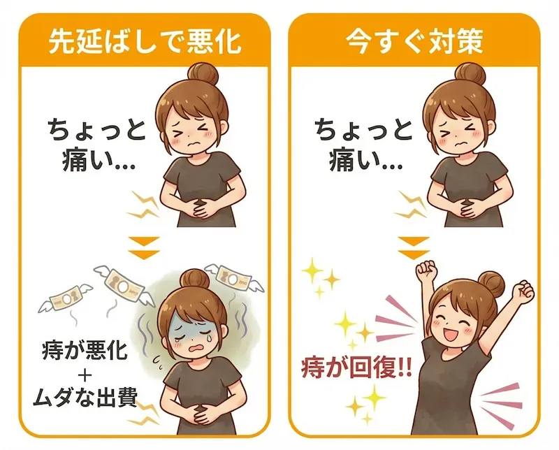 すぐに購入すれば、痔は軽快に向かうんですが、そのまま放置してたら悪化するしキャンペーン終了で安く買えずに無駄にお金を払う可能性も・・・
