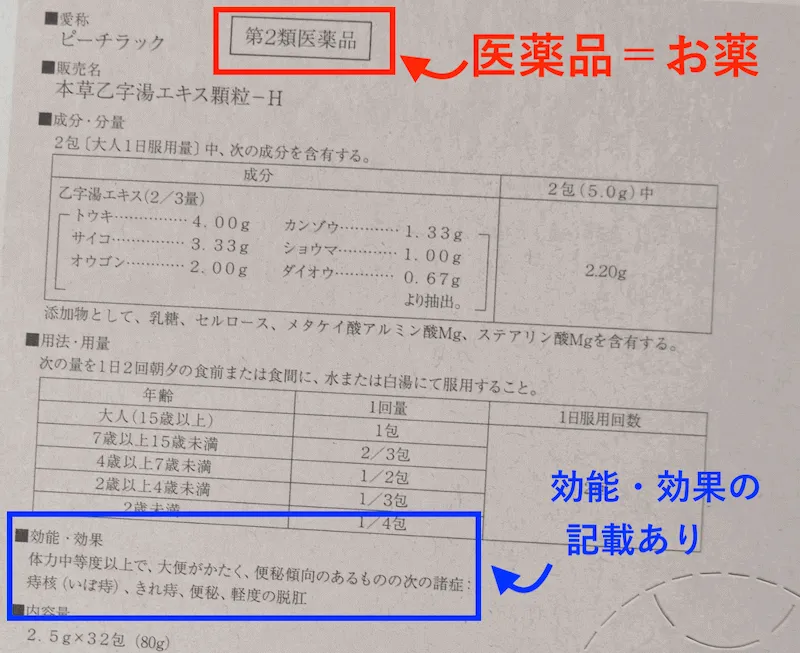 第2類医薬品ですし、効能・効果も確実に記載されています。